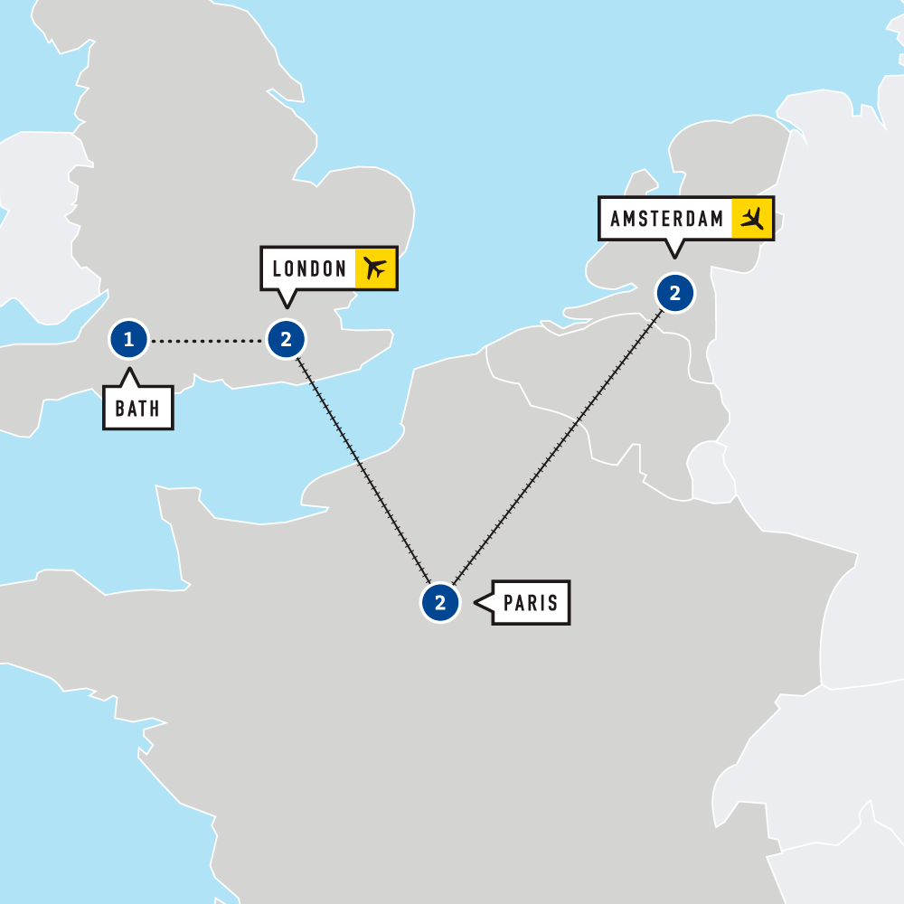 Discover three of Europe’s most captivating capitals: Amsterdam, Paris, and London. Explore Dutch art and culture at the Rijksmuseum, experience the moving history of the Anne Frank House, cruise the canals and the Seine, and marvel at iconic landmarks from the Eiffel Tower to Big Ben. Extend your adventure with an optional excursion to Bath and Stratford-upon-Avon to walk in the footsteps of Shakespeare and uncover ancient Roman history.